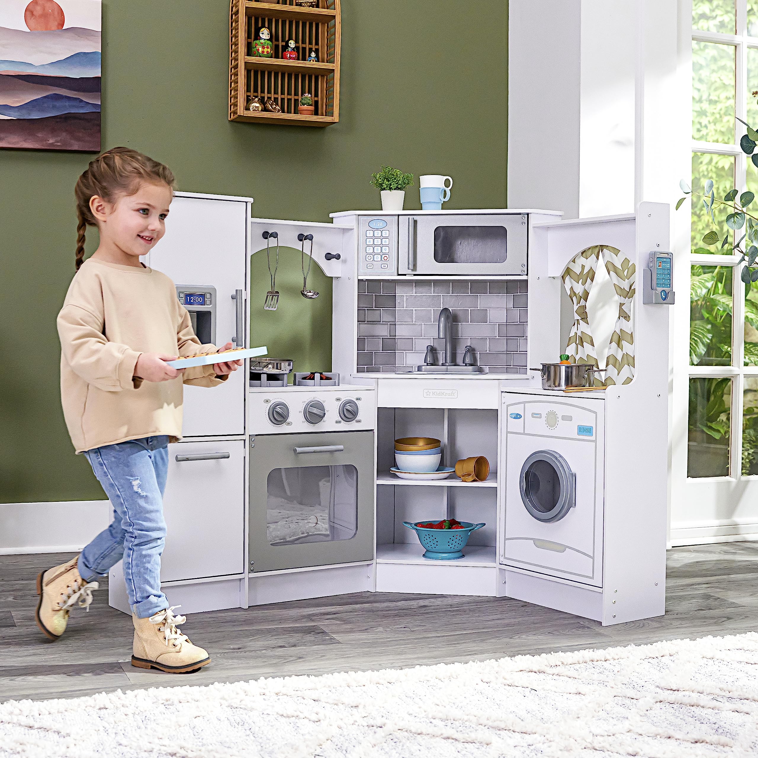 KidKraft Ultimate Corner Wooden Play Kitchen with Lights & Sounds, Play Phone and Curtains, White